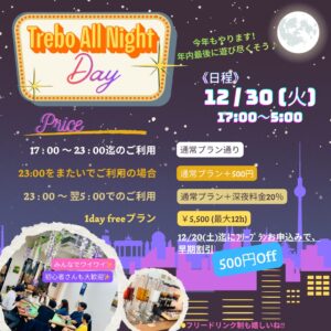 20:00より新イベント「夜トレボ会・語らナイト交流会」開催予定の為、通常営業は15:00~20:00までとなります。