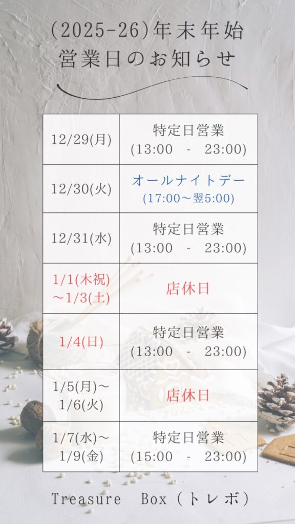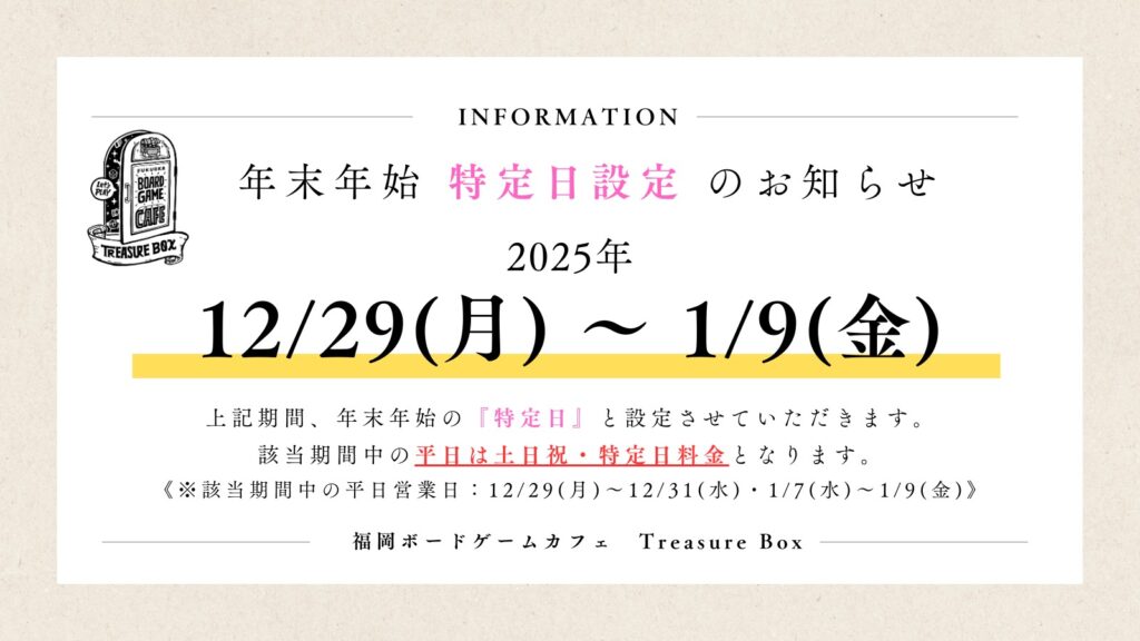 2025ー2026年の年末年始における、12月29日より1月9日までの期間を「年末特定日」とし、期間中における平日は「土日祝・特定日料金」とさせていただきます。